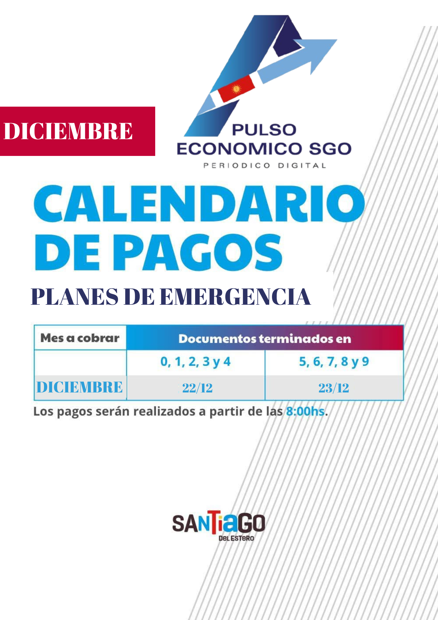 El Gobierno de la Provincia de Santiago del Estero inició el pago de los Planes de Emergencia, un beneficio destinado a brindar apoyo económico a los sectores más vulnerables de la población. El pago se realizará de manera presencial en las sucursales del Banco Santiago del Estero (BSE) de Capital y La Banda.
