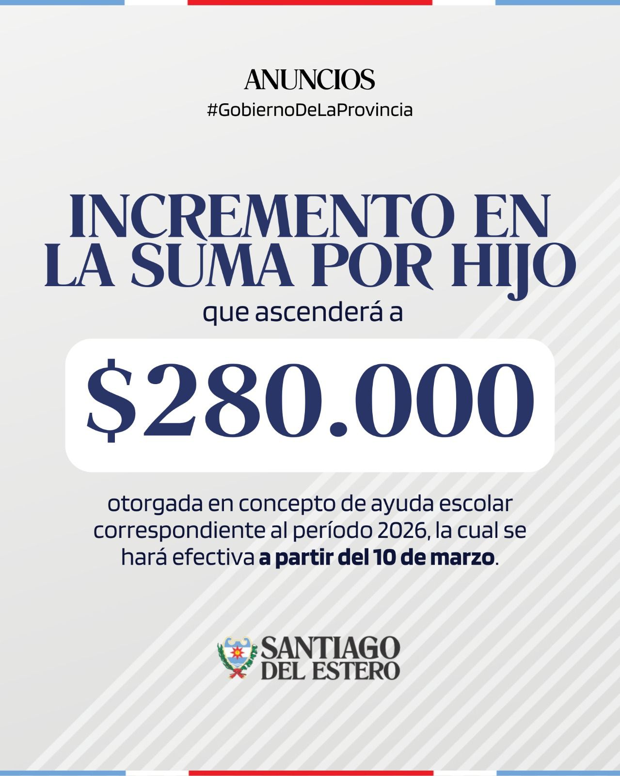 5. Incremento en la suma por hijo, que ascenderá a $280.000, otorgada en concepto de ayuda escolar correspondiente al período 2026, la cual se hará efectiva a partir del 10 de marzo.