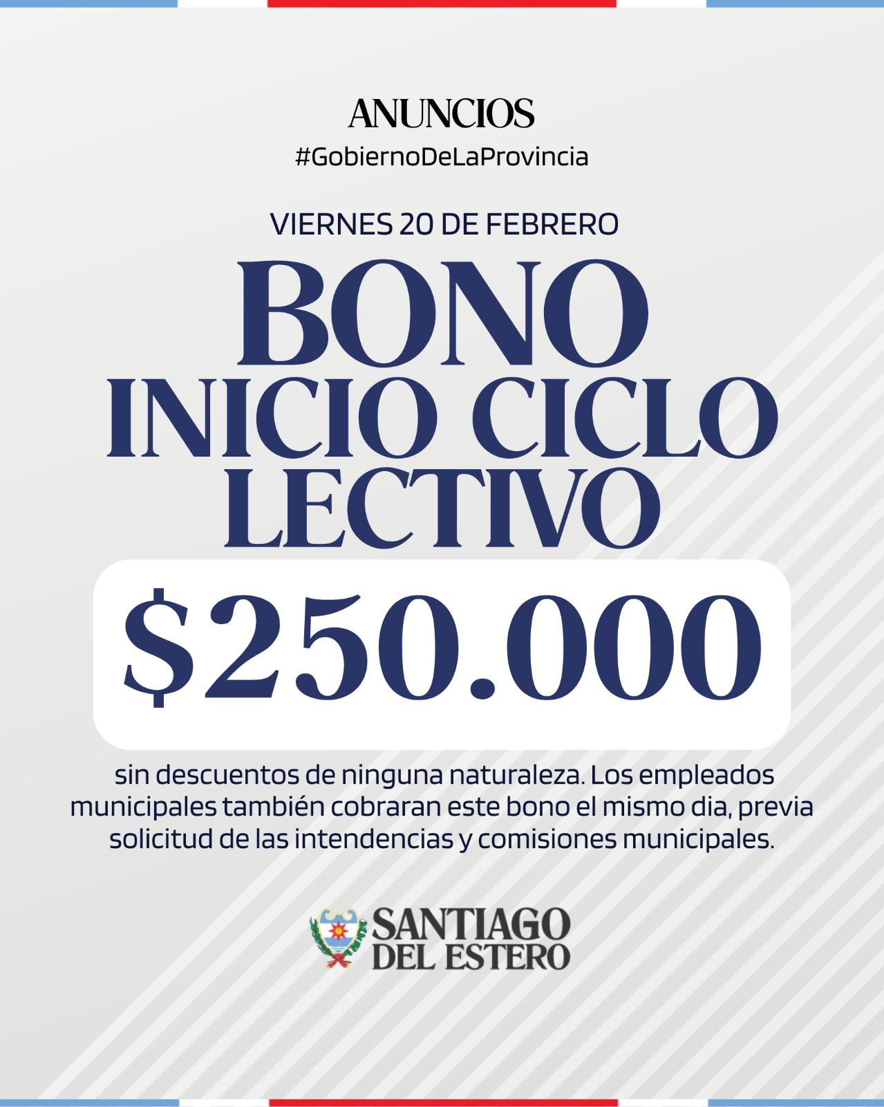 4. El primer bono previo al inicio del ciclo lectivo será abonado el próximo viernes 20 de febrero, por la suma de $250.000 sin descuentos de ninguna naturaleza. Los empleados municipales también cobraran este bono el mismo dia, previa solicitud de las intendencias y comisiones municipales.