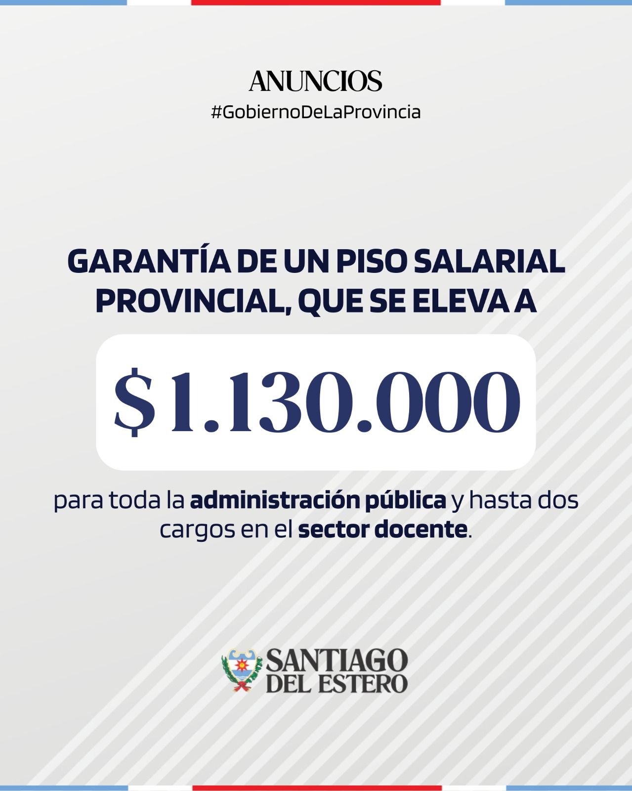 El Gobierno de la Provincia de Santiago del Estero informó un nuevo acuerdo salarial destinado a los trabajadores de la Administración Pública, luego de las reuniones con la Mesa de Diálogo y Trabajo, tanto con el sector docente como los que componen la representación de la administración pública, se acordaron las siguientes pautas salariales: