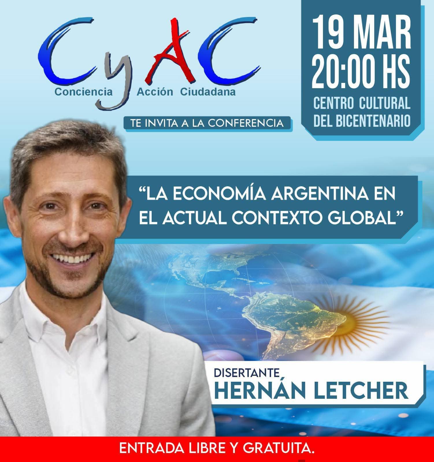 La charla, organizada por el grupo Conciencia y Acción Ciudadana (CyAC), contó con una gran convocatoria de jóvenes y profesionales interesados en conocer más sobre la realidad económica del país. Letcher, quien también se desempeña como contador público nacional, docente y periodista, ofreció un análisis claro y profundo de la situación económica argentina.